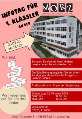 Am Donnerstag, den 26.02.2026, von 16 bis 18 Uhr laden wir 4. Klässler und ihre Eltern zu einem Infotag an der Montfort-Realschule Zell ein. Kommen Sie vorbei und lernen Sie bei Rundgängen unsere Schule kennen. Die Schulleitung steht Ihnen bei Fragen gerne zur Verfügung.